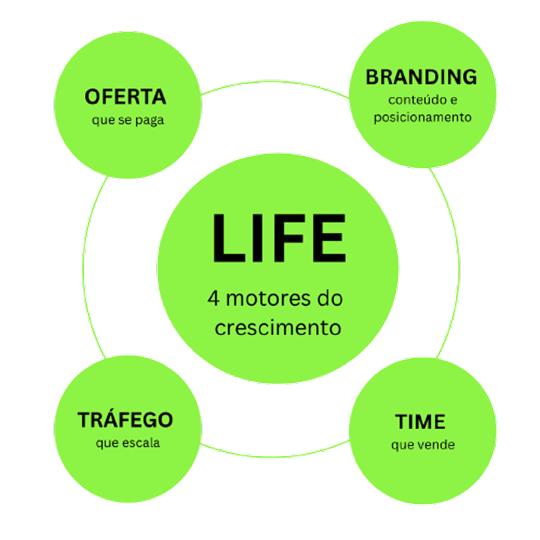 Acreditamos que o crescimento acontece quando marca, tráfego e vendas trabalham juntos e é exatamente isso que o Plano de Aceleração Life entrega: um método com 4 Motores que conectam estratégia, posicionamento, geração de demanda e conversão comercial.